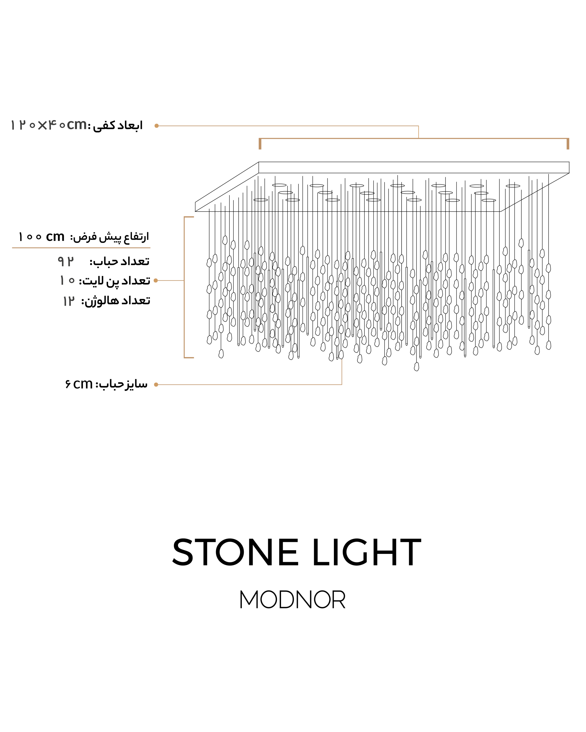 تعداد حباب در این سایز 92 عدد است، این تعداد حباب، نوری فراگیر و یکنواخت را ایجاد میکند. حبابهای پیرکس، مقاومت بالایی دارند. آنها در برابر ضربه و تغییرات دما مقاوم هستند. این ویژگی، دوام آویز را در طولانی مدت تضمین میکند. استون لایت 120X40، ترکیبی از زیبایی و عملکرد است.