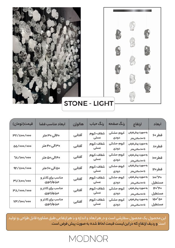 در جهان نور و نورپردازی، هر محصول روشنایی یک قصه برای تعریف کردن دارد. برخی از آنها، قصههایی از درخشش و تجمل را روایت میکنند، اما استون لایت 120X40، داستانی متفاوت برای گفتن دارد. این آویز ریسهای، نه فقط یک منبع نور که یک اثر هنری دستساز است. مدنور با دقّت بسیار و استفاده از آخرین تکنولوژی، حبابهای پیرکس استون را طراحی و تولید میکند. طراحان مدنور این محصول را با الهام از آرامش و استحکام سنگ طراحی کردهاند و این لوستر حس صمیمیت و آرامش را به فضای شما میآورد. استون لایت 120X40، انتخابی بینظیر برای کسانی است که به دنبال زیبایی خاص و کارایی بالا هستند.
