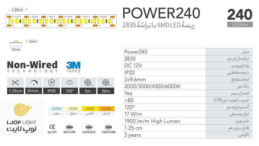 ریسه ۱۲ ولت لوپ لایت با تراکم ۲۴۰ و با درجه حفاظت IP20 طراحی و تولید میشود. این ریسه برای استفاده در فضاهای داخلی و خشک مناسب است و در برابر رطوبت و گرد و غبار مقاوم نیست. همچنین برای نصب در پشت تلویزیون، زیر کابینت، دکوراسیون داخلی، پلهها و نردهها مناسب است.